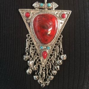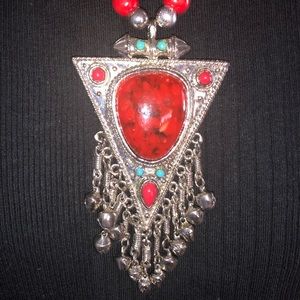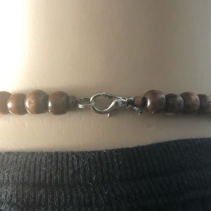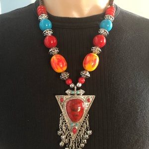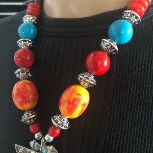 Substantial in size. Never worn. Mixed material. Wood, plastic, and metal. Eye catcher. Lobster claw closure. Weighs 127 grams. Photos taken with and without flash.