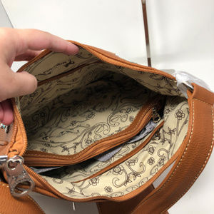 Made of PU Leather Antique silver floral belt-buckle Floral tooling on the front Stitch and stud details single strap 2 compartments inside one zipper on the back and an open pocket Matching wallet included!