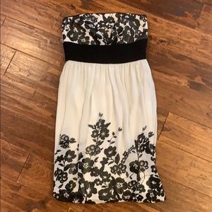 Black and white patterned semi formal dress. Pleated bust with boning for a great and flattering fit. Wide band black bust with pleated skirt makes for a great fit on multiple body types.