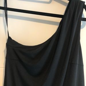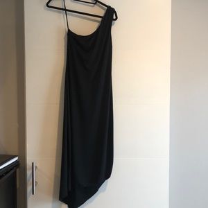 Black one shoulder cocktail dress. Length is to mid/low calf just above the ankle and has an asymmetrical bottom.