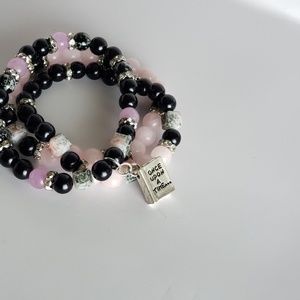 Rose quartz, black pearl's: pink, black and white square glass beads with silver and rhinestone accents. Silver charm