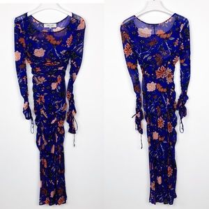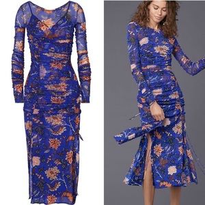 DVF | Canton Blue Mesh Overlay Blue Ruched Midi Dress