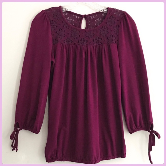 NEW LISTING! HP Work Week Party! This top is so pretty! It has pretty crochet daisies and the sleeves have cute ties! It has a stretch bottom hem! Size Small Bust 17 Length 25