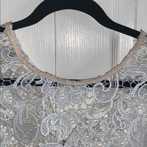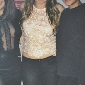 White lace top with gold undertones. Perfect for any beach vacation. Easily work with a nude bra without being too revealing :)