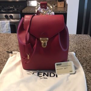 NWT 100% authentic "F is For Fendi" backpack.. This Fendi is breathtakingly timeless! This leather backpack features gold-tone hardware, a drawstring fastening , slip pocket , double adjustable back straps, and two keys for lock clasp closure. Retails for $1900 plus tax. Size is 8 x 10x 6. Color is fragola red. Bring home this beauty for an unbeatable price .. Feel free to ask more questions.