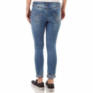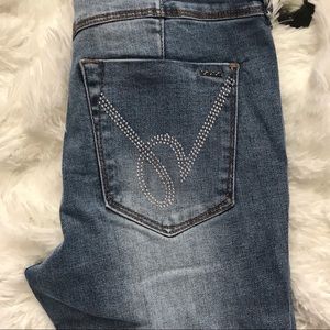 Show off your edgy style in these ripped skinny jeans with rolled cuffs. The rips are rugged and the rolled cuffs add a trendy feature. Rhinestone back pockets for a touch of glam. One button and zipper fly and five pockets.