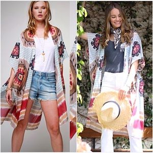 Wrap yourself in bohemian style & comfort in this stunning chic kimono cardi wrap. Open front with arm holes & side slits. Pair with tank & skinnies or works perfect as a swim beach cover up. 34” x 39” 100% cotton. One Size Fits Most