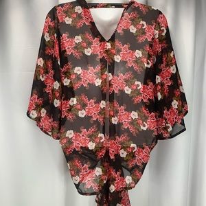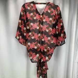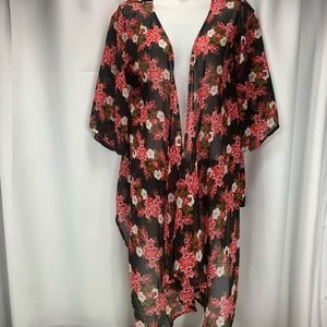 Lovely Kimono Cover Up is black with pink and white flowers. Has longer front panels that you can let drape or tie up for a different look. )B-0075)
