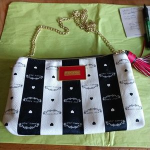 This is super cute black, white, and red crossbody with the chain strap little red dazzle inside has each side has a pocket inside the chain is 22in long the measurements of the actual bagger on the pictures lots of views left in this adorable purse