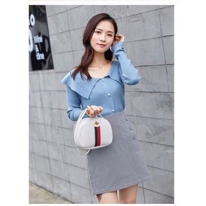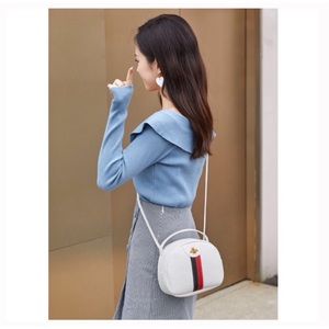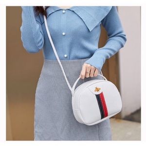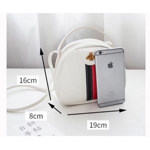Crafted Pebble PU Leather Crossbody Features trendy design bumble bee gold tone embellishment with contrasting stripes of blue red white variations. Versatile carrying options shoulder crossbody hand travel cosmetics bag