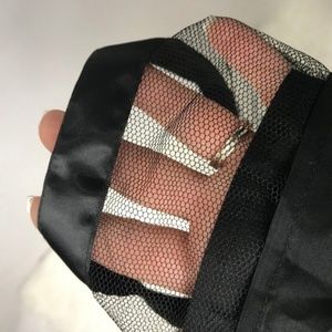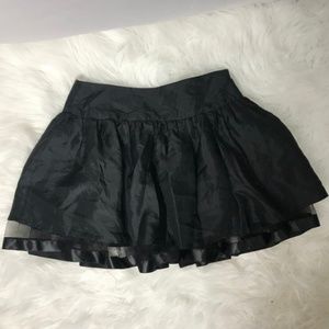 You'll adore this black satin mini skirt with mesh and ribbon trim.
