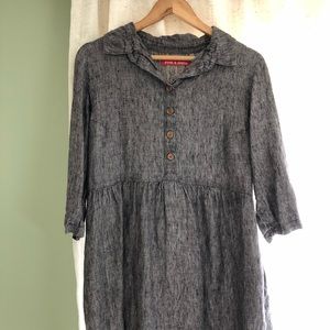 Linen midi dress with pockets! Pyne and Smith is cult classic eco-fashion, and this dress is built to last. Tie back is flattering for the waist. Always washed on cold and tumbled for a few minutes then hung to dry! No holes or stains although the linen does have some imperfections naturally as shown. Perfect for breastfeeding (so I’m told)!