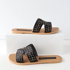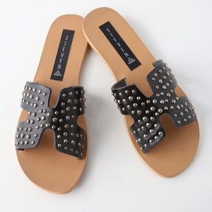 Spend a summer day exploring Santorini in the Steven by Steve Madden Greece Studded Black Leather Slide Sandals! Smooth, genuine leather, embellished with antiqued gold studs, shapes a wide, toe band with notched detail and side cutouts, creating a simple-yet-stylish look that's perfect for everyday wear. Slide-on design.