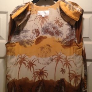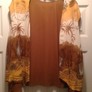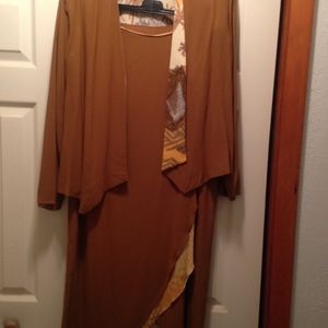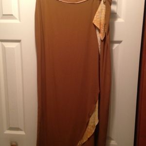 Coffee colored two piece. The skirt is ankle length and layered on the side.