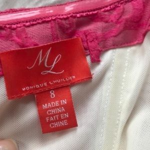 ML Monique Lhuillier strapless pink floral jacquard peony dress with high low neckline. Show-stopping, gets many compliments.