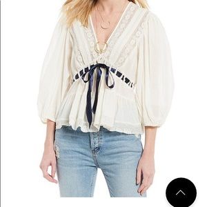 New pheasant shirt, romantic and flow sleeves, shear material - cotton nice fit with wide blue ribbon at waist.