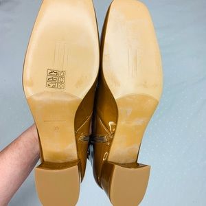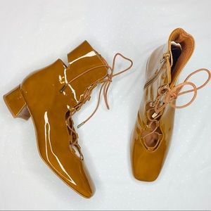 Anthropologie & Miista quirky lace up cut out boots in honey brown. High shine on these gorgeous patent leather boots, chunky block heel and cutout lace up front.