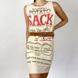 Vintage from the 1960s cotton iconic and collectible! Inspired by Marilyn Monroe's photo shoot in a potato sack. No closures, fits overhead. In good, wearable condition. Reads: "Looks like a sack, feels like a sack, is a sack""Fill with 100 pounds or more of charm, and save money on new French inspired creations""For evening wear, add mink trimmings" bust: up to 36"waist/hips: up to approx. 37"length: 38.5" Be the life of the party! Show with and without belt.(not included)
