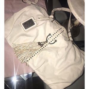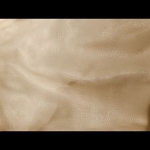 Very soft flexible material! Good for traveling or even a beach bag. Picture of spots is the bottom of the purse, the backside has a few spots from being stored next to a dark purse, barely noticeable.