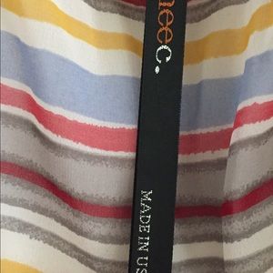 Long strapless striped tube dress. Elastic bands at chest and waist. Lined.