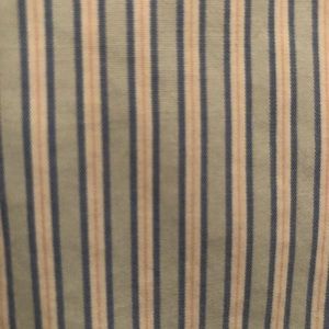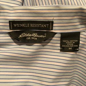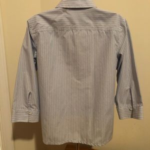 Light blue and faint pink pin-striped button down shirt. Great alone or with a camisole/tank top underneath. 3/4 sleeves. Wrinkle resistant - no ironing. Machine washable. EUC. No stains, tears. Smoke-free home.