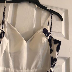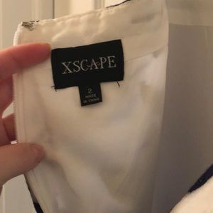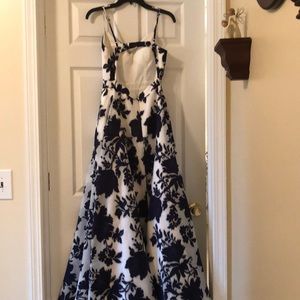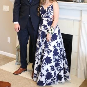 Escape prom dress size 2. Only worn twice so it is in great condition! The only alterations made were a slight hem to the skirt to fit a 5’0”-5’3” girl. Floral pattern is navy blue. The straps are adjustable and there is padding in the dress that acts as a built in bra. Dress is not see-through at all and HAS POCKETS!!!! Feel free to inquire if you have more questions!