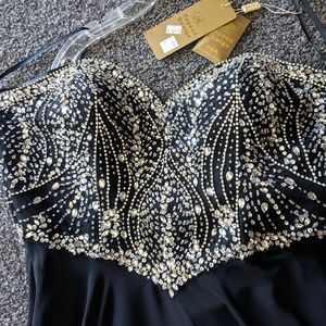 Beautiful beaded black gown. Strapless with lace-up back. Sweetheart neck line. Loose A line skirt.