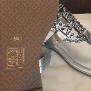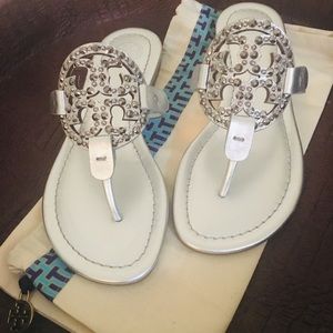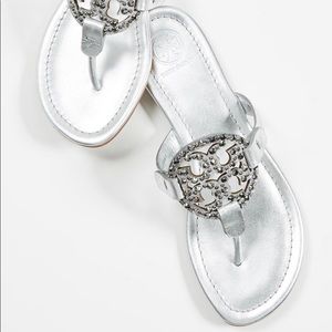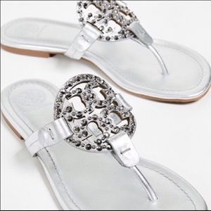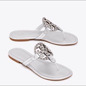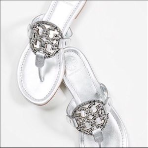 Gorgeous Tory Burch Miller Sandals. Silver leather with embellished logo. New without box. Never worn. Dust bag included. These sandals are just beautiful! Dress up or wear casual. ✨Sold Out Everywhere!✨