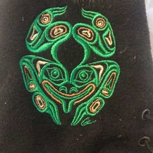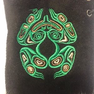 Black, fuzzy, fingerless gloves! Very unique and soft! The green embroidery appears to be of a frog.