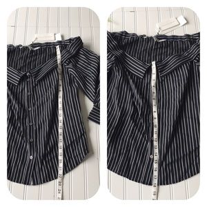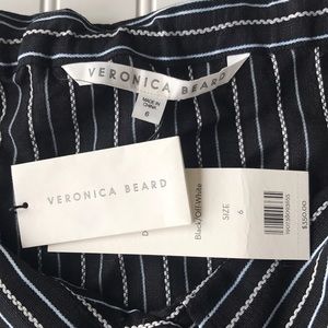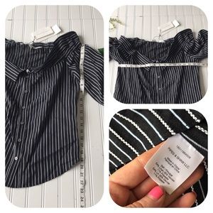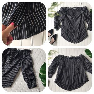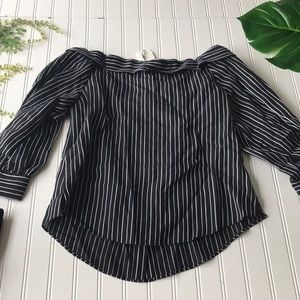 This NWT black and off white striped off the shoulder Veronica Beard top is super sexy but sophisticated. Button up design with collar for a professional flair with a sexy twist to a classic look. Brand new, never worn. Black and white striped design with a light hint of blue. #W NWT Striped black white Veronica beard off shoulder top