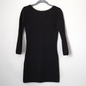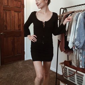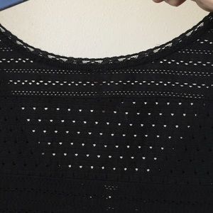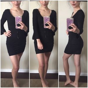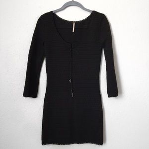 Black Free People body con mini dress with little eyelet holes throughout. Pretty much like new condition! Worn and washed a few times but no flaws :) Theres little eyelet holes throughout the entire dress so keep that in mind! If you wear nude or black underwear/bra it looks nice and you can’t even really see them through the holes at all.