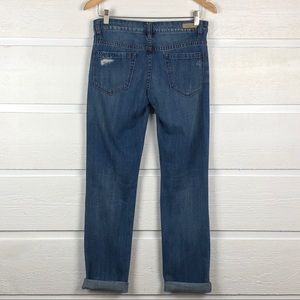 Distressed jeans With blown out knees and upper thigh distressing. 5-pocket detailing. Mild wear in crotch area. Lots of life left in these laid back jeans!