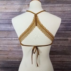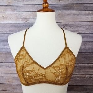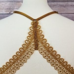 This bralette is so feminine and lacy.The racer back is an inverted V made of lace. This bralette ties in the back to close. Straps are adjustable. Brand new with tags.