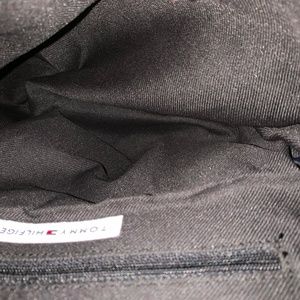 Classic Tommy Hilfiger vinyl purse in navy with red accents. Velcro enclosures on side pockets. Closure on strap.