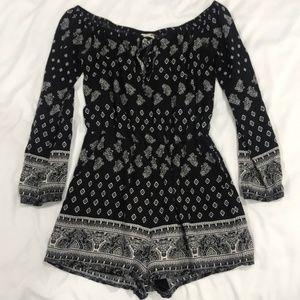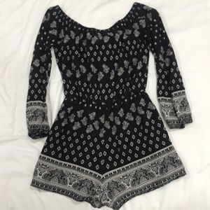 Description: Black printed romper with 3/4 length cinched sleeves. Worn off the shoulder. There’s a black slip on the bottom and an elastic waistband and sleeves.