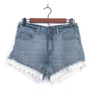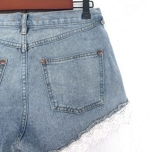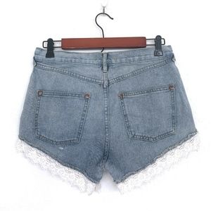 Free People Lacey Denim Shorts Womens Size 27 Light Blue White Cutoff Crochet. Good condition- few minor stains (zipper placket, front legs, back pocket - shown photos). Center front zipper with button closure. Front/back pockets. Crochet bottom hems.