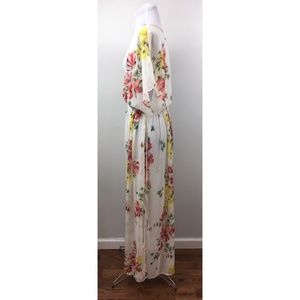 Gorgeous maxi dress/vest/duster that is so versatile- can be worn over jeans/cutoff shorts & a tank as a maxi vest, with a slip underneath as a dress, or over a bathing suit as a swim coverup. Front is completely open except for buttoned waist. Cap sleeves, back slit, side slits & waist tie.