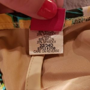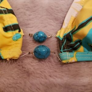 Yellow, white, turquoise and brown floral print with silver wire, silver beading and turquoise stones on top and turquoise stones on side ties on bottoms. The bottoms show Petite for size, but I would say that equals Medium as that is usually the size I wear. Moderate coverage on bottoms.