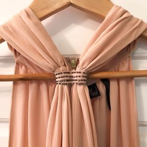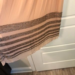 I bought this dress at the Mango flagship store in Barcelona, Spain and wore once to a rehearsal dinner. It is so pretty, a beautiful blush color with amazing sparkly beaded detail! The neckline is so flattering! Perfect dress for a summer wedding or event!