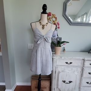 Super adorable seersucker look romper with a tie front and subtle cut out below the tie. Elastic ruched back, adjustable straps. Pull on style.