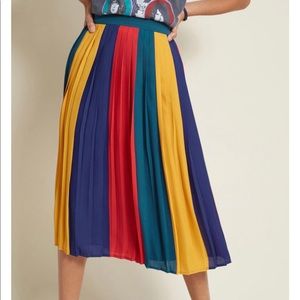 This colorblock midi skirt from our ModCloth namesake label will be quite 'pleats' to make your wardrobe's acquaintance! Though this style will begin as a brand new ensemble addition, its high waistline, chiffon fabric, accordion-style folds, and palette of mustard, navy, red, and teal hues will feel like long-cherished faves in no time flat.