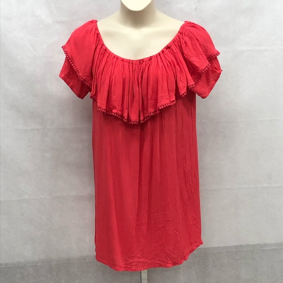 Wonderful coral tunic can be worn off the shoulder or on the shoulder. Has short sleeves. Can be worn as a short dress, tunic top or a beach coverup. Fun matching trim with little circles.