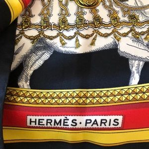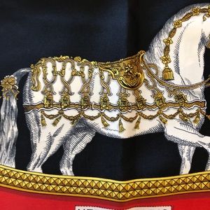 Designed by Jacques Eudel and first issued in 1962, this luxe silk Hermès scarf by Neiman Marcus is a rare piece. Beautiful equestrian motif in elegant black/gold/red.