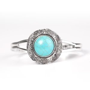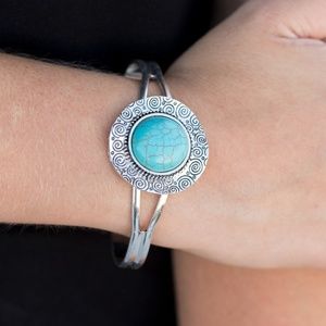 Stamped in dizzying swirls, a delicately hammered silver frame spins around a turquoise stone center, creating a handcrafted inspired cuff.