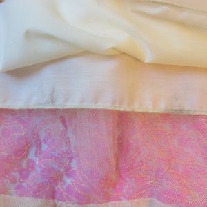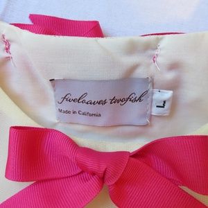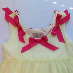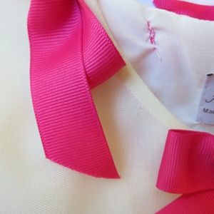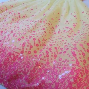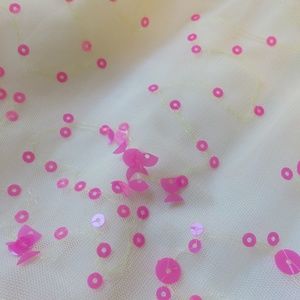 This size Large dress from Fiveloaves Twofish is sure to become a favorite, with its hot-pink sequins, mesh tulle and adorable bows along the neckline. It's in good used condition for a couple of dirt marks on the inside of the lining along the back hem (not visible from the outside) (see picture), slight fraying on the bows' ends (see picture for example), a flaw in the sequins on the back of the dress (see picture) and two tiny pinholes along the neckline on the front (see picture).