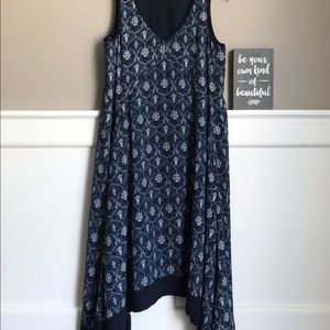 This beautiful sleeveless printed chiffon dress is flattering for any body type. The plunging v-neckline is bold yet flattering by itself, or can be worn with a cami for a more conservative look. With the handkerchief hemline, you can dress it up or down!