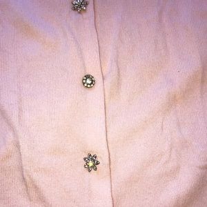 Pink cashmere three quarter sleeve cardigan with alternating flower and round rhinestone snap buttons. Please note there is one loose snap you will need to see back down as shown in the last photo.