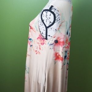 Flowy sleeveless dress with floral print. Pockets. Silky material with a romantic theme. Tannish-golden like colr with hues of orange, red, pinks, green, blues. Boutique dress by Acting Pro. EUC.