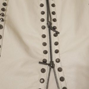 100% authentic white supple leather fully lined sleeveless dress with gunmetal studded trimming throughout back & front-such amazing detail on this hot number- this dress is a showstopper!! Has front double zipper so you can control lengths from top to bottom-Prestine condition! Perfect for those summer nights on the town! Stunning!!!no rips tears etc. measurements upon request!