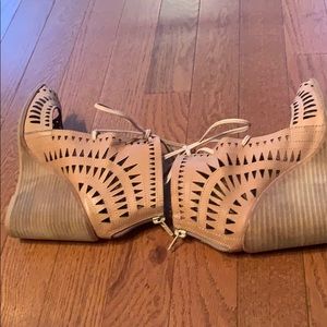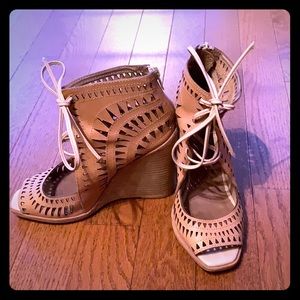 These gently used Jeffrey Campbell peep toe wedges are looking for a new home. They have a zipper in the back.